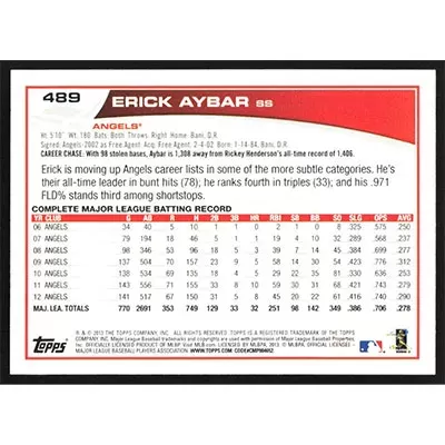 This is a 2013 Topps Emerald Erick Aybar baseball card. The card is #489 and pictures show condition.