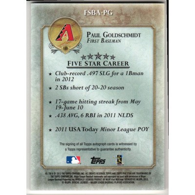 This is a 2013 Topps Five Star Autographs Paul Goldschmidt autographed baseball card. This card has been signed, in blue, by Paul Goldschmidt, and is certified authentic by Topps. The card is #FSBA-PG and pictures show condition. This card is limited; #'d 156/386.