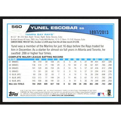 This is a 2013 Topps Gold Yunel Escobar baseball card. The card is #560 and pictures show condition. This card is limited; #'d 1897/2013. Team(s): Tampa Bay Rays