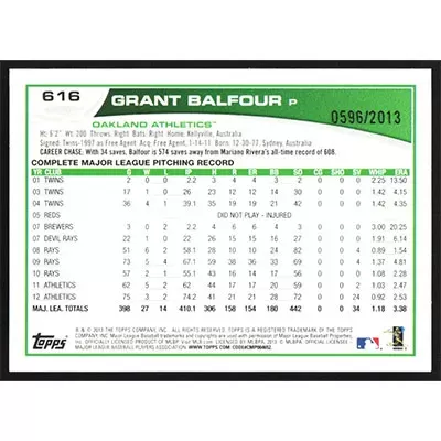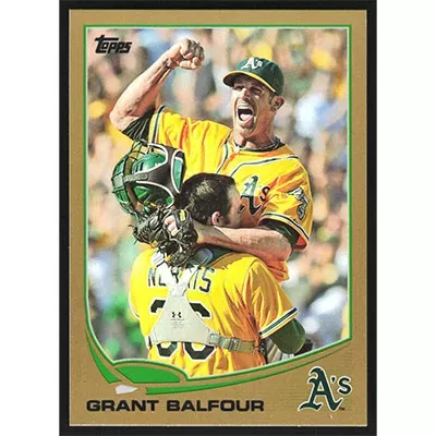 This is a 2013 Topps Gold Grant Balfour baseball card. The card is #616 and pictures show condition. This card is limited; #'d 0596/2013. Team(s): Oakland Athletics