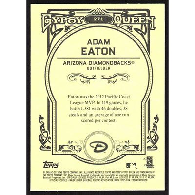 This is a 2013 Topps Gypsy Queen Adam Eaton baseball card. The card is #271 and pictures show condition. Team(s): Arizona Diamondbacks Rookie Card (RC)