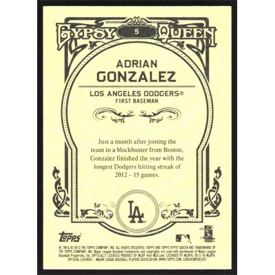 This is a 2013 Topps Gypsy Queen Adrian Gonzalez baseball card. The card is #5 and pictures show condition.