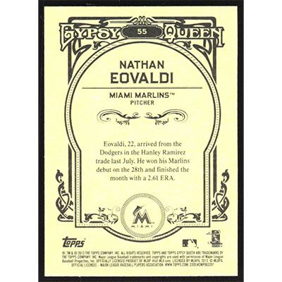 This is a 2013 Topps Gypsy Queen Nathan Eovaldi baseball card. The card is #55 and pictures show condition.