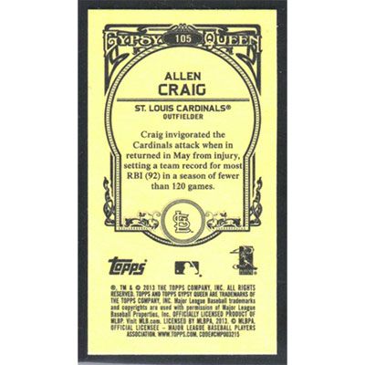 This is a 2013 Topps Gypsy Queen Mini Allen Craig baseball card. The card is #105 and pictures show condition.