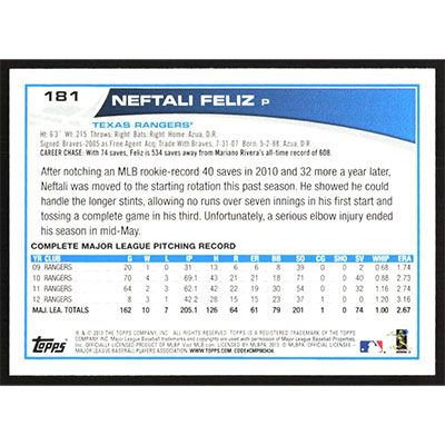 This is a 2013 Topps Opening Day Neftali Feliz baseball card. The card is #181 and pictures show condition.