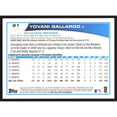 This is a 2013 Topps Opening Day Yovani Gallardo baseball card. The card is #21 and pictures show condition.