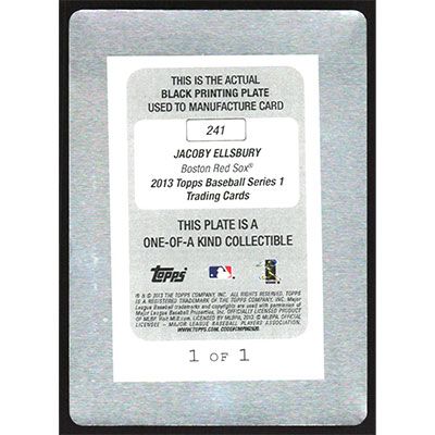 This is a 2013 Topps Printing Plate Black Jacoby Ellsbury baseball card. The card is #241 and pictures show condition. This card is limited; #'d 1/1. Team(s): Boston Red Sox