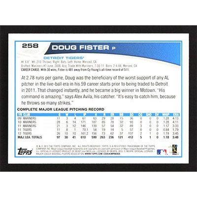 This is a 2013 Topps Silver Slate Blue Sparkle Wrapper Redemption Doug Fister baseball card. The card is #258 and pictures show condition. Team(s): Detroit Tigers