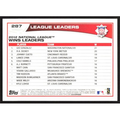 This is a 2013 Topps Silver Slate Blue Sparkle Wrapper Redemption Gio Gonzalez, R.A. Dickey and Johnny Cueto League Leaders baseball card. The card is #287 and pictures show condition.