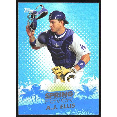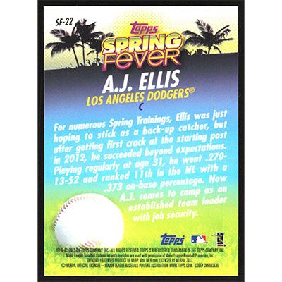 This is a 2013 Topps Spring Fever A.J. Ellis baseball card. The card is #SF-22 and pictures show condition.