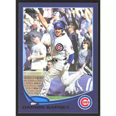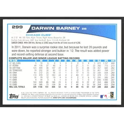 This is a 2013 Topps Toys 'R Us Purple Darwin Barney baseball card. The card is #299 and pictures show condition.