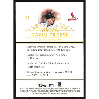 This is a 2013 Topps Tribute David Freese baseball card. The card is #11 and pictures show condition.