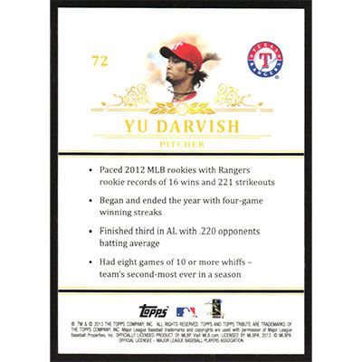 This is a 2013 Topps Tribute Yu Darvish baseball card. The card is #72 and pictures show condition.