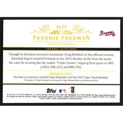 This is a 2013 Topps Tribute Autographs Blue Freddie Freeman autographed baseball card. This card has been signed, in blue, by Freddie Freeman, and is certified authentic by Topps. The card is #TA-FF and pictures show condition. This card is limited; #'d 31/50.