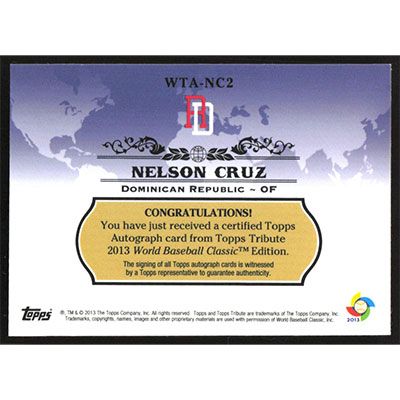 This is a 2013 Topps Tribute WBC Autographs Nelson Cruz autographed baseball card. This card has been signed, in blue, by Nelson Cruz, and is certified authentic by Topps. The card is #WTA-NC2 and pictures show condition.