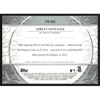 This is a 2013 Topps Triple Threads Relics Adrian Gonzalez 7x Jersey baseball card. The card is #TTR-AG3 and pictures show condition. This card is limited; #'d Oct-36.