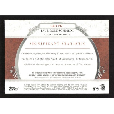This is a 2013 Topps Triple Threads Unity Relic Autographs Sepia Paul Goldschmidt Jersey autographed baseball card. This card has been signed, in blue, by Paul Goldschmidt, and is certified authentic by Topps. The card is #UAJR-PG1 and pictures show condition. This card is limited; #'d 52/75.