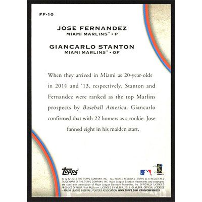 This is a 2013 Topps Update Franchise Forerunners Jose Fernandez and Giancarlo Stanton baseball card. The card is #FF-10 and pictures show condition. Team(s): Miami Marlins