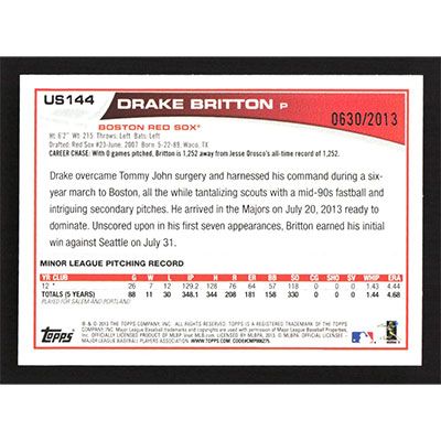 This is a 2013 Topps Update Gold Drake Britton baseball card. The card is #US144 and pictures show condition. This card is limited; #'d 0630/2013. Team(s): Boston Red Sox Rookie Card (RC)