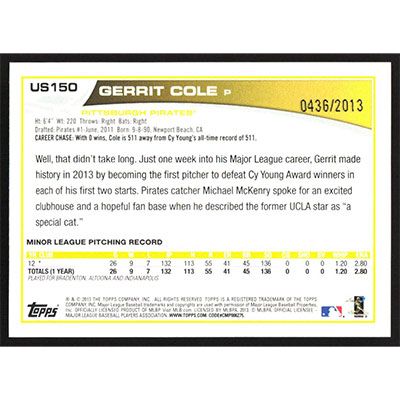 This is a 2013 Topps Update Gold Gerrit Cole baseball card. The card is #US150 and pictures show condition. This card is limited; #'d 0436/2013. Team(s): Pittsburgh Pirates Rookie Card (RC)