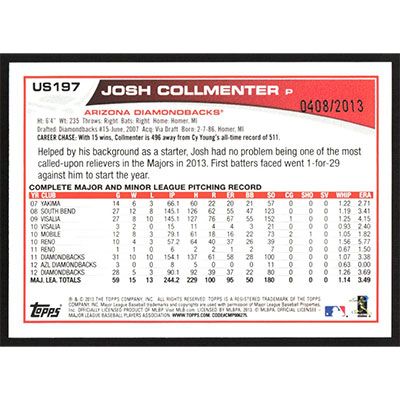 This is a 2013 Topps Update Gold Josh Collmenter baseball card. The card is #US197 and pictures show condition. This card is limited; #'d 0408/2013. Team(s): Arizona Diamondbacks