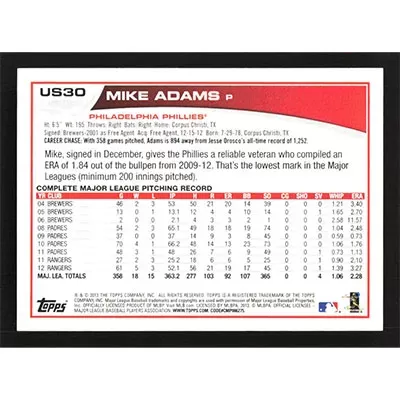 This is a 2013 Topps Update Target Red Mike Adams baseball card. The card is #US30 and pictures show condition.
