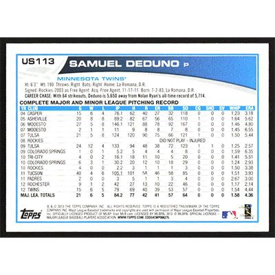 This is a 2013 Topps Update Samuel Deduno baseball card. The card is #US113 and pictures show condition.