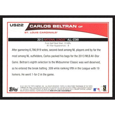 This is a 2013 Topps Update Carlos Beltran All-Star baseball card. The card is #US22 and pictures show condition.