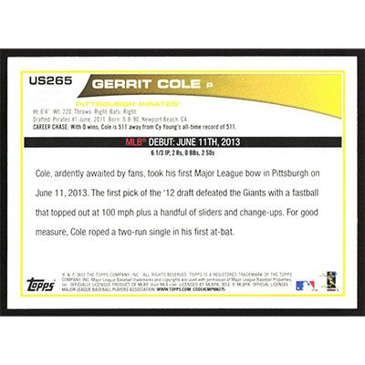 This is a 2013 Topps Update Gerrit Cole Rookie Debut baseball card. The card is #US265 and pictures show condition. Team(s): Pittsburgh Pirates Rookie Card (RC)
