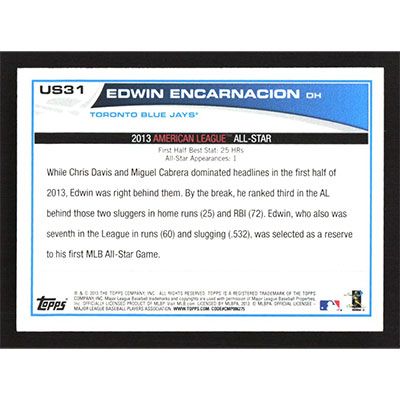 This is a 2013 Topps Update Edwin Encarnacion All-Star baseball card. The card is #US31 and pictures show condition.