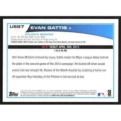 This is a 2013 Topps Update Evan Gattis Rookie Debut baseball card. The card is #US87 and pictures show condition. Team(s): Atlanta Braves Rookie Card (RC)
