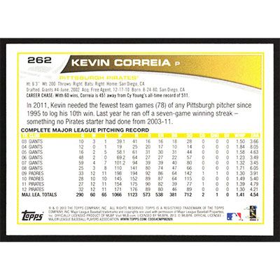 This is a 2013 Topps Wal-Mart Blue Kevin Correia baseball card. The card is #262 and pictures show condition.
