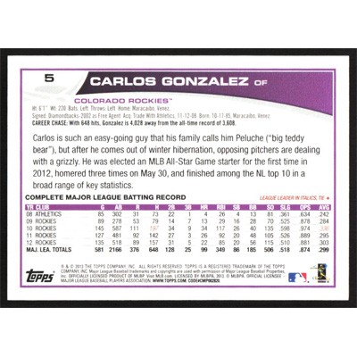 This is a 2013 Topps Wal-Mart Blue Carlos Gonzalez baseball card. The card is #5 and pictures show condition.