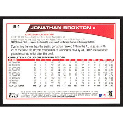 This is a 2013 Topps Wal-Mart Blue Jonathan Broxton baseball card. The card is #51 and pictures show condition.