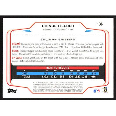This is a 2014 Bowman Prince Fielder baseball card. The card is #136 and pictures show condition.