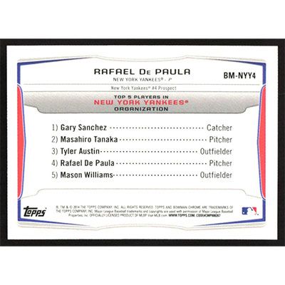 This is a 2014 Bowman Chrome Bowman Scout Top 5 Mini Refractors Rafael De Paula baseball card. The card is #BM-NYY4 and pictures show condition. Team(s): New York Yankees