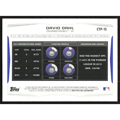 This is a 2014 Bowman Chrome Draft Top Prospects David Dahl baseball card. The card is #CTP-15 and pictures show condition.