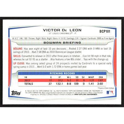 This is a 2014 Bowman Chrome Prospects Victor De Leon baseball card. The card is #BCP101 and pictures show condition.