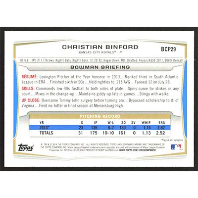 This is a 2014 Bowman Chrome Prospects Christian Binford baseball card. The card is #BCP29 and pictures show condition.