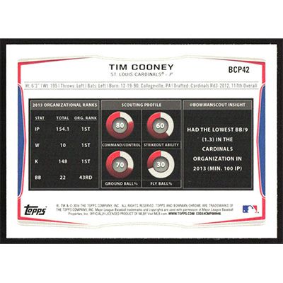 This is a 2014 Bowman Chrome Prospects Tim Cooney baseball card. The card is #BCP42 and pictures show condition.