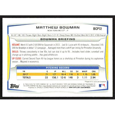 This is a 2014 Bowman Chrome Prospects Matthew Bowman baseball card. The card is #BCP72 and pictures show condition.