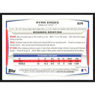 This is a 2014 Bowman Chrome Prospects Ryan Eades baseball card. The card is #BCP8 and pictures show condition.