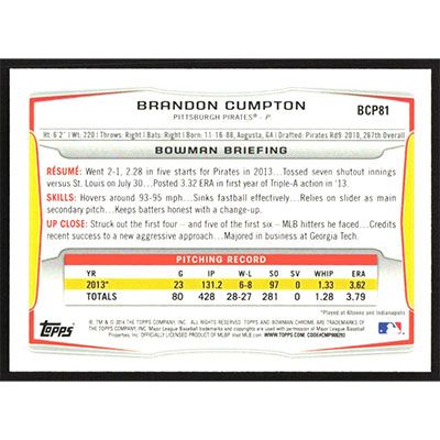 This is a 2014 Bowman Chrome Prospects Brandon Cumpton baseball card. The card is #BCP81 and pictures show condition.