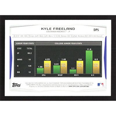 This is a 2014 Bowman Draft Kyle Freeland autographed baseball card. This card has been signed, in blue, by Kyle Freeland, and is guaranteed authentic by Ballcardz.com. The card is #DP5 and pictures show condition.