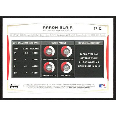 This is a 2014 Bowman Draft Top Prospects Aaron Blair autographed baseball card. This card has been signed, in blue, by Aaron Blair, and is guaranteed authentic by Ballcardz.com. The card is #TP-42 and pictures show condition.