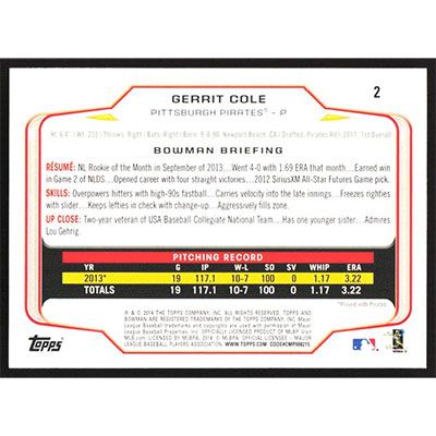 This is a 2014 Bowman Hometown Gerrit Cole baseball card. The card is #2 and pictures show condition.