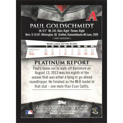 This is a 2014 Bowman Platinum Paul Goldschmidt baseball card. The card is #10 and pictures show condition.