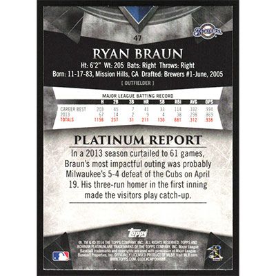 This is a 2014 Bowman Platinum Ryan Braun baseball card. The card is #47 and pictures show condition.