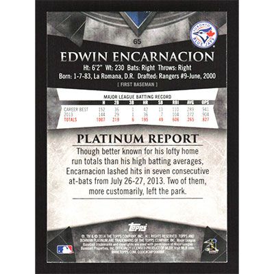 This is a 2014 Bowman Platinum Edwin Encarnacion baseball card. The card is #65 and pictures show condition.
