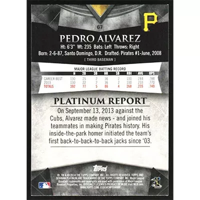 This is a 2014 Bowman Platinum Pedro Alvarez baseball card. The card is #67 and pictures show condition.
